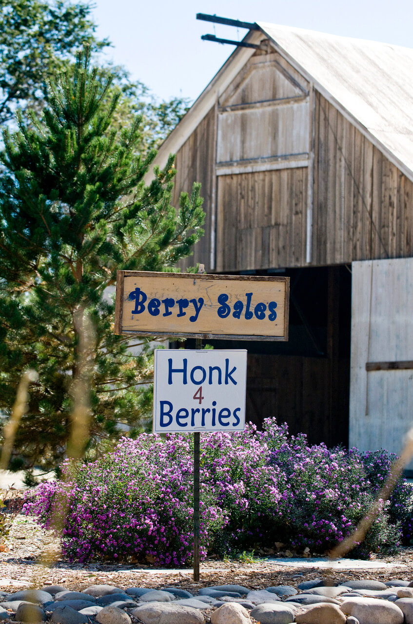 Driving up to Jacobs Family Berry Farm during harvest season, from late summer to early fall, is a sensory pleasure. Visitors are welcomed with a sign that reads, “Berry Sales, Honk 4 Berries” at the head of a circular drive, the center colored with daisies, blanket flowers, alliums, and yarrow, and scented by lavender and sage. The white farmhouse, with its manicured lawn, roses, butterfly bushes, and fruit trees sits to the right; berries are to the left, the outbuildings toward the back.