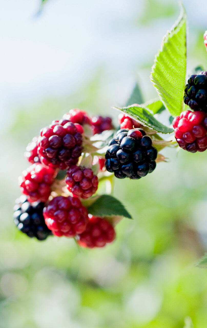 Now, to see the land in production, you’d never know the family hadn’t farmed for generations. Irrigation is by drip, weeds discouraged with black plastic. Canes are trained on wire, held aloft with a recycled metal support system — Jacobs’ original design. The 16 varieties of blackberries and raspberries are in neat rows, situated to make best use of the elements.