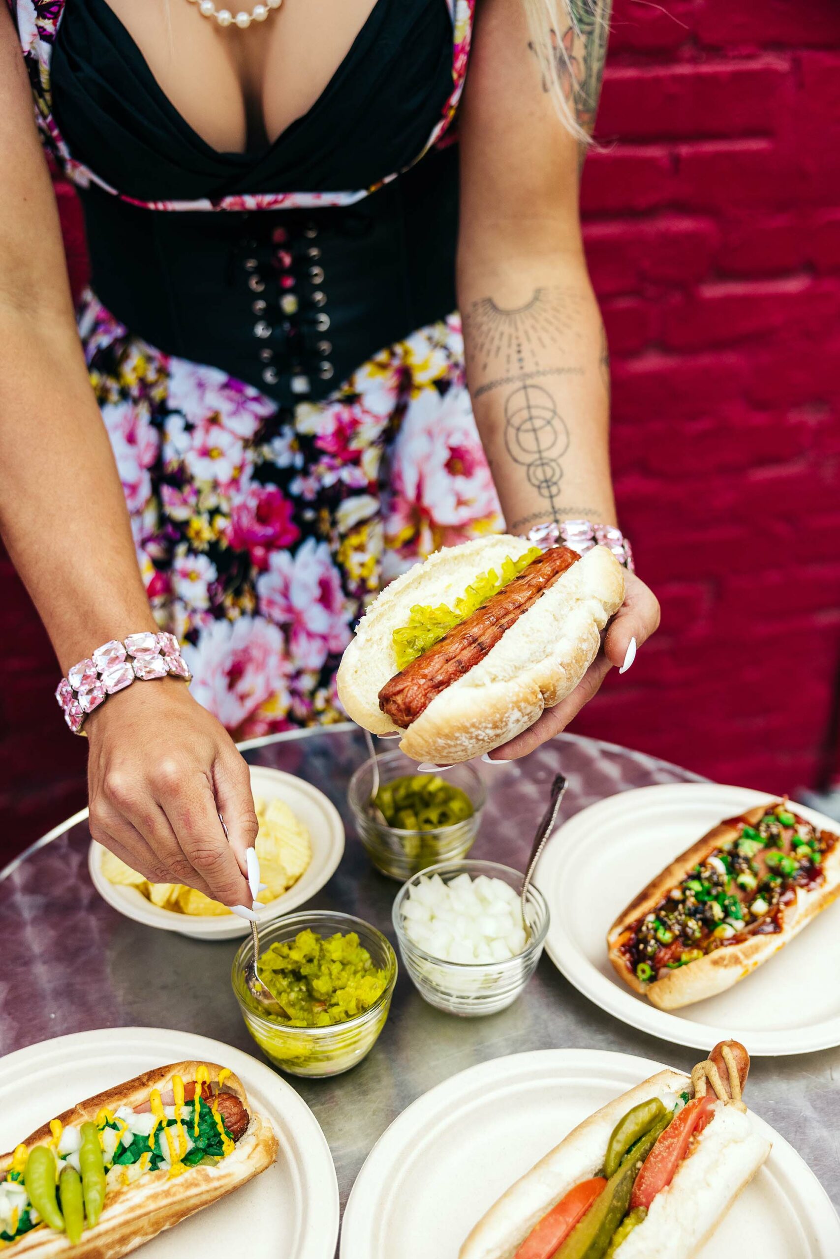 Evans enjoys ketchup, mustard, and relish on her dog