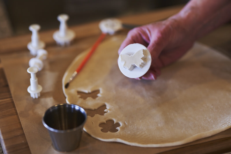 Nyberg’s trick is using store-bought pastry dough — ideal thanks to its thin, consistent texture — for the decorations on top. An ever-growing collection of cookie cutters, as well as a pastry wheel and a pie crust mold with braids and twists, are essential in her decorating process. Nyberg also likes to play with negative space by taking cutouts from the top of the pie and layering the shapes elsewhere on the masterpiece.