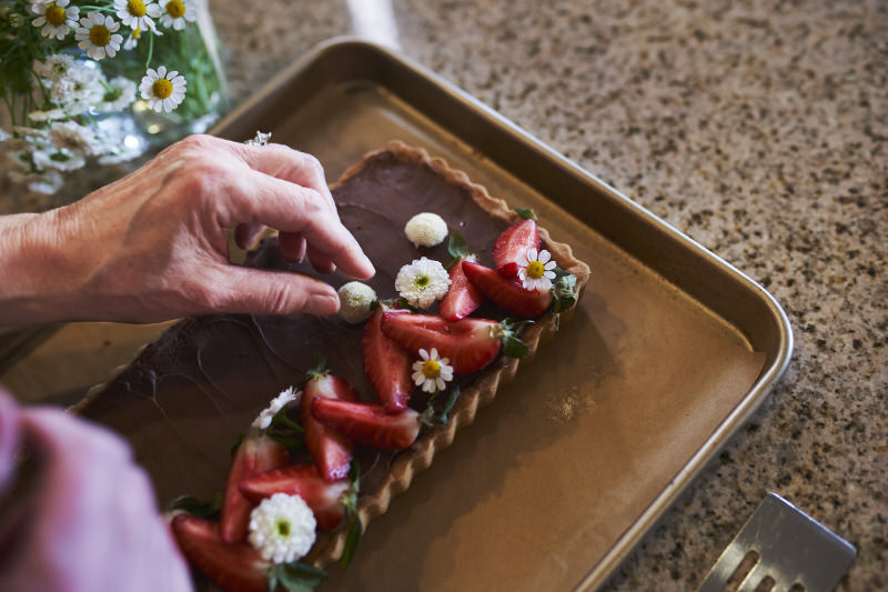 Flowers, herbs, and berries are another favorite topper for Nyberg. She beautifully trimmed a chocolate-glazed chocolate tart with a chocolate crust (A+ on the volume of chocolate) with a crescent-shaped cluster of baby’s breath (which is not edible) and frozen blueberries and blackberries, which have a lovely, frosted look.